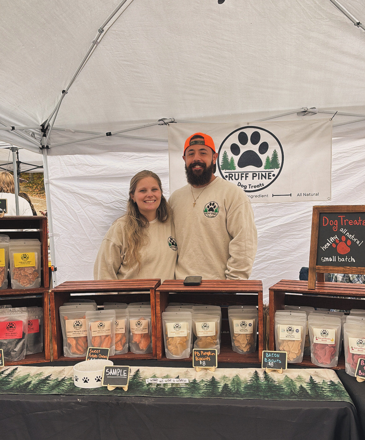 We are Nicholas and Emily Conley the owners of Ruff Pine Dog Treats. In 2022, we bought a dehydrator and started making our own dogs Willow and Blue single ingredient treats. We wanted to know exactly what we were feeding our dogs with no additives or preservatives. In 2023, we decided to make it into a business and Ruff Pine was created. Since then we have expanded into minimal ingredient biscuits and a freeze dried dog treats.