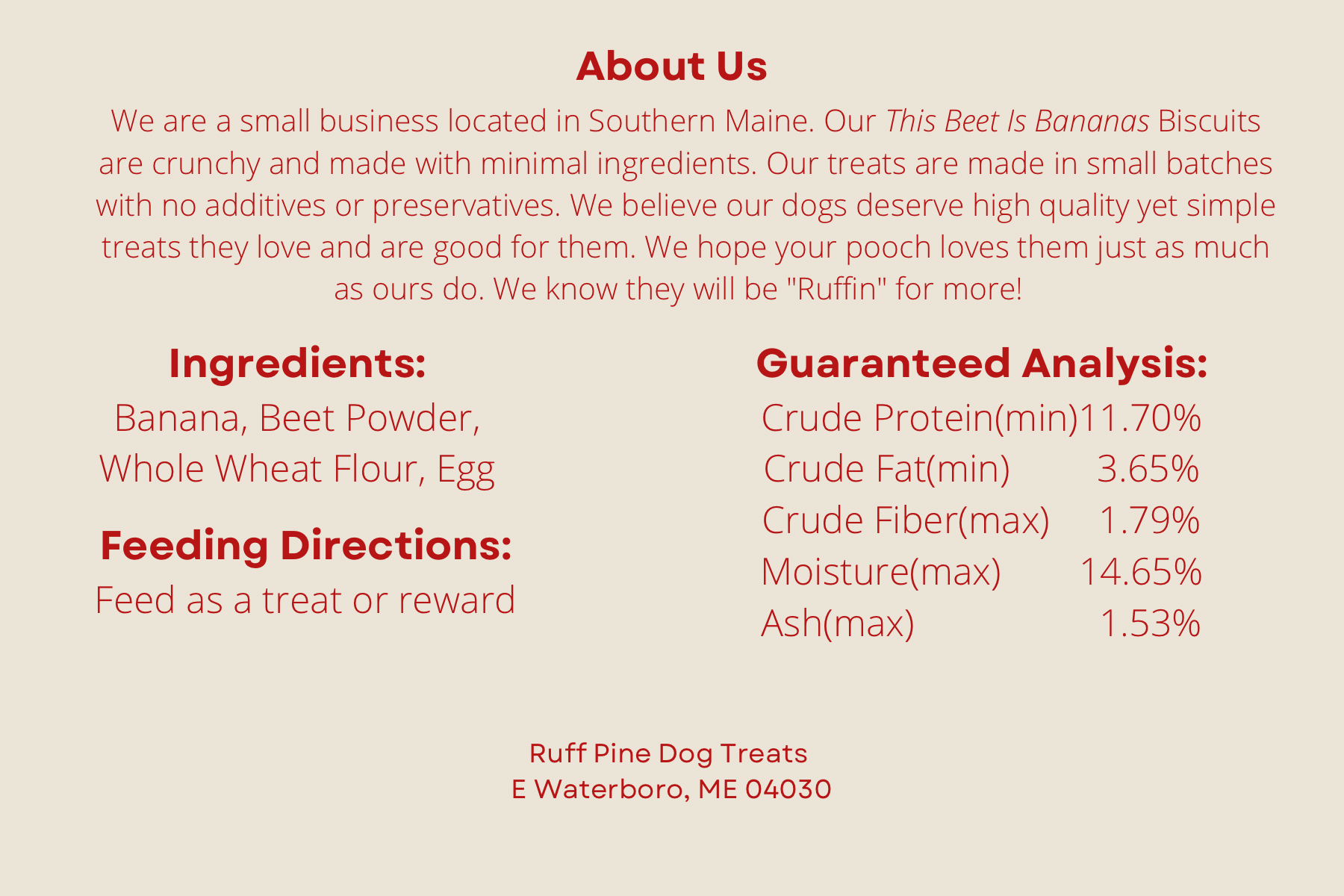 Due to popular demand, our Beet & Banana biscuits are here to stay! Each bag comes with 25 crunchy yummy biscuits. Our biscuits are made with minimal ingredients and Beet Powder made by us. Beets and Bananas are filled with fiber, vitamins, antioxidants and helps boost immune system. Your dog will not only love these treats, but benefit from as well.
