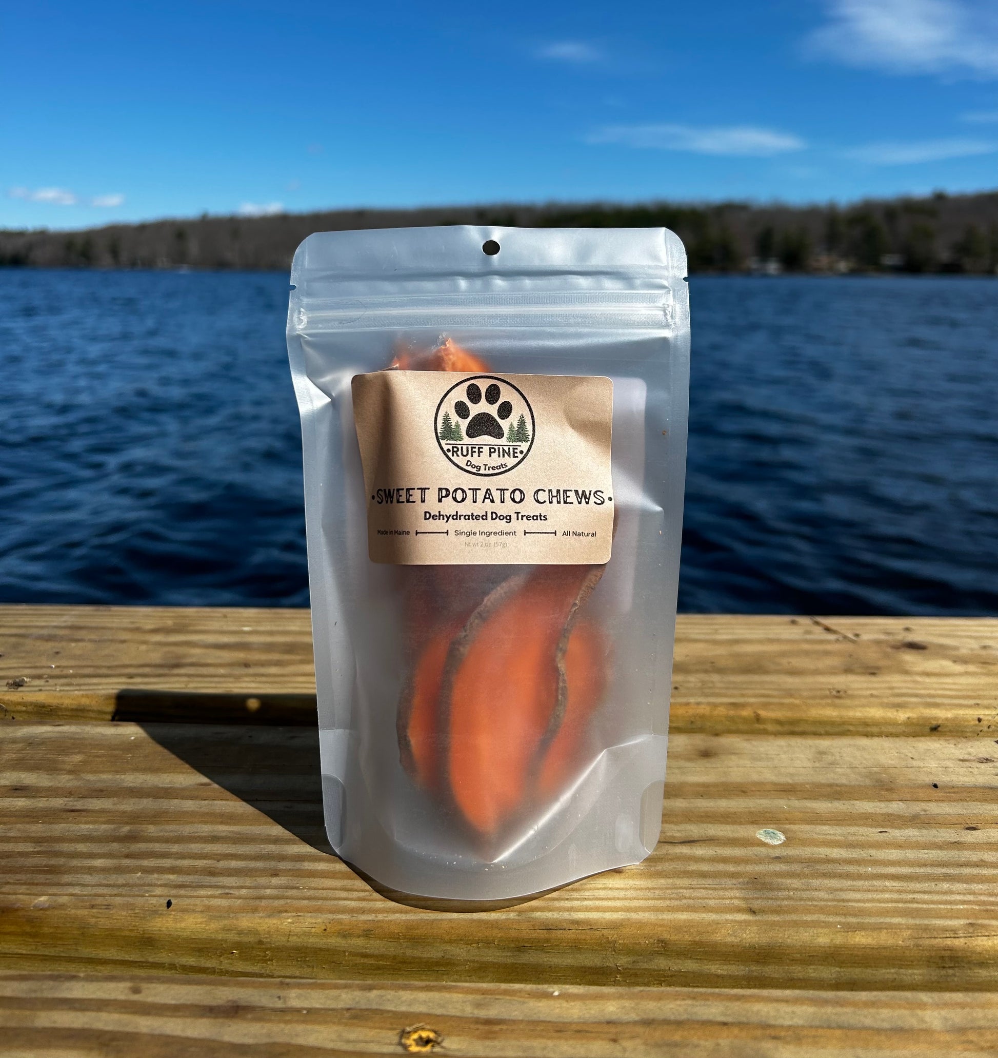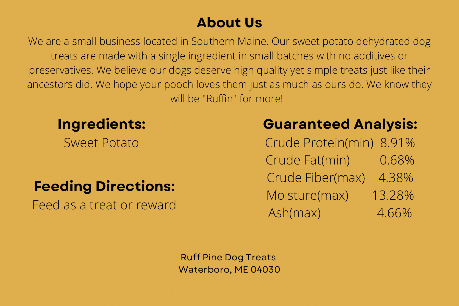 Our sweet potato chews are dehydrated right here in Southern Maine. These treats are all natural made out of 100% sweet potatos. No additives or preservatives. These treats have a good chew to them and may be difficult for some dogs.