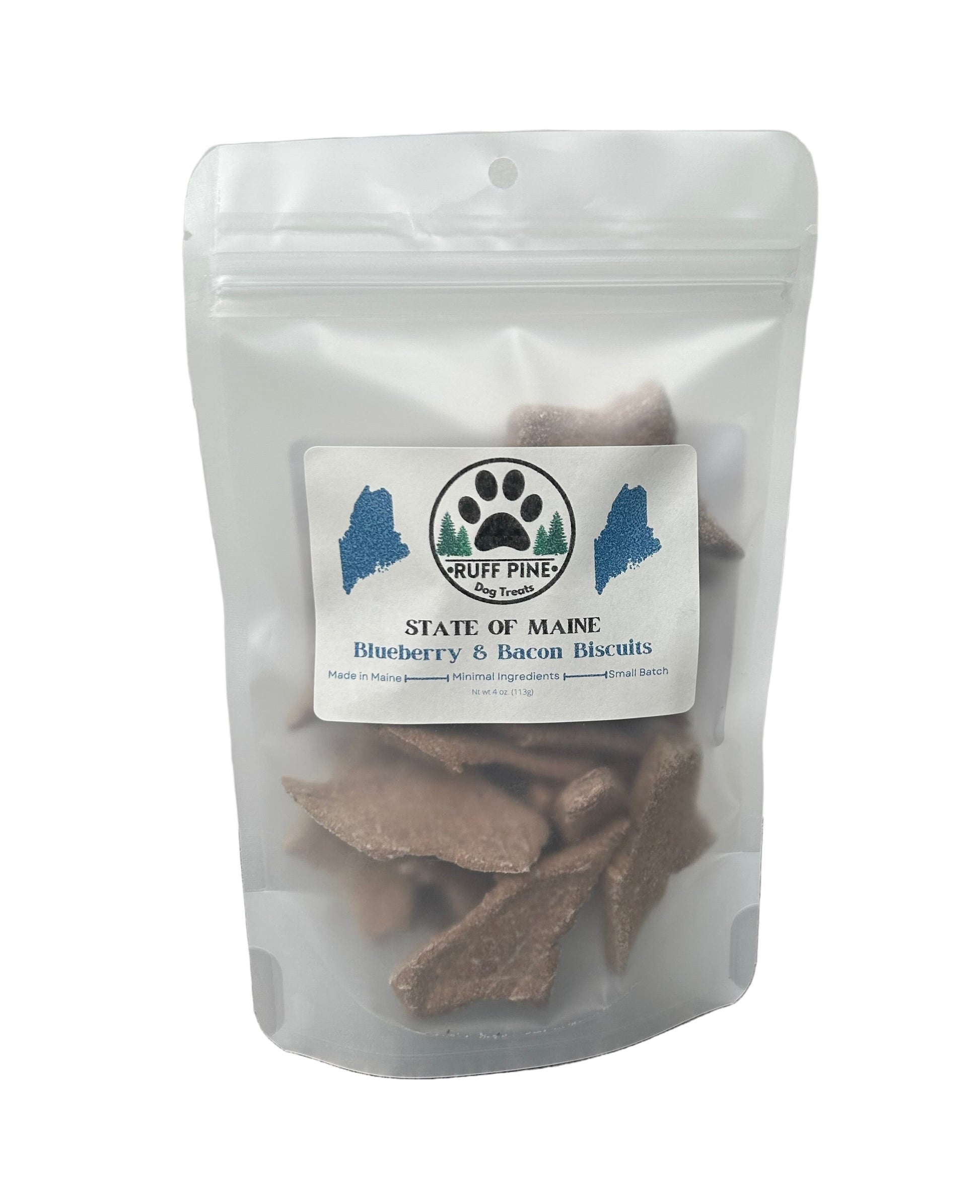 State of Maine shaped Blueberry & Bacon biscuits. Using our signature Blueberry & Bacon recipe, these treats are delicious. Using Maine blueberries, your pup will taste Maine in every bite. Biscuits are crunchy! 🫐🥓